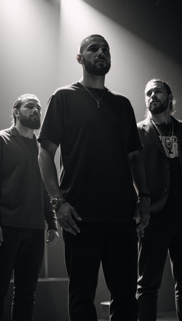 Group of three African American men, each displaying unique expressions and styles, illuminated by warm orange lighting, emphasizing their individuality and strength, AI generated
