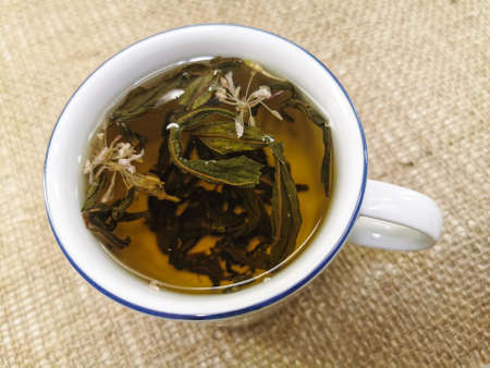 Healthy lifestyle concept. Mix of green and black tea with the addition of a flower mixture. Tea is brewed in a cup. Photo on the background of burlap.