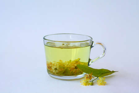 Glass cup of linden tea, and linden flowers on a white wooden table. Healthcare hot drink.