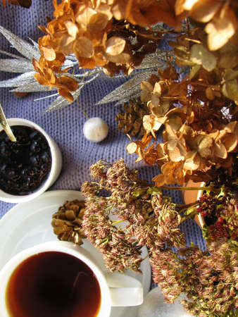 A beautiful white porcelain cup of herbal tea and a saucer of dried lemongrass sit on a dark wooden table with a decoration of dried flowers around it. a book for pleasant reading. Copy the space bar. Top view.