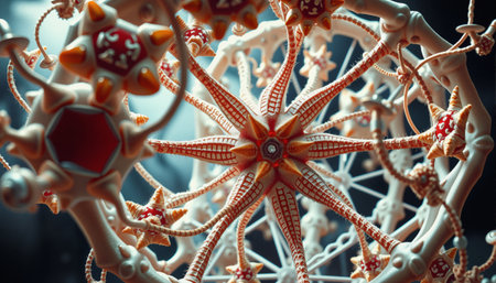 The image presents a complex, abstract structure resembling a geometric fusion of biology and machinery. Central to the design is a star-shaped motif with multiple pointed extensions radiating outwards. The structure appears to be constructed of interconnected segments, each adorned with striped patterns and vibrant colors, primarily in hues of red, orange, and white. Surrounding the central form are intricate, coiled components, giving the image a sense of dynamism and movement. The background is a blurred mix of soft greys and blues, which helps in accentuating the vivid tones of the central figure. This image showcases a blend of organic and mechanical aesthetics, creating a captivating visual symmetry.