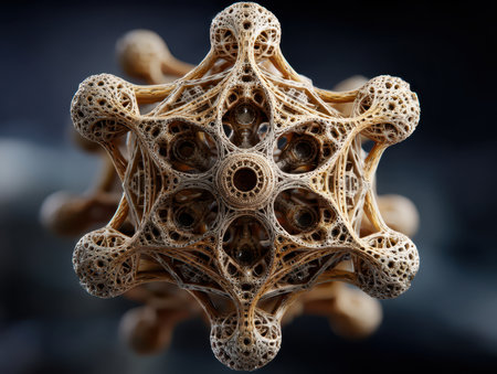 Intricate geometric structure with a network of intertwined, hollow tubes forming a complex, symmetrical pattern. The design appears organic, resembling a 3D printed sculpture or latticework