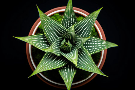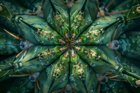 A close up of a cactus with a green and brown color. The cactus has a unique and intricate design, with many small green leaves and brown spots. Concept of natural beauty and complexity