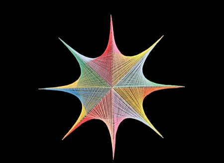 A complex multicolored geometric shape resembling a star, crafted from paper, sits on a smooth blue surface against a matching background, lit from the side.