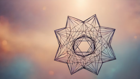 An abstract, geometric star shape is presented against a dark backdrop. The object exhibits iridescent colors with multiple facets, appearing translucent and crystalline. The composition features a front-facing perspective with soft lighting and a blurred background, making it suitable for design projects or illustrative purposes.