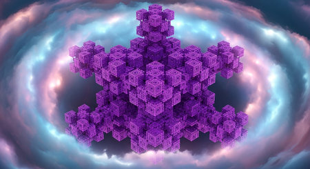 A highly complex purple fractal structure, reminiscent of a snowflake or a branching crystal, is centrally positioned. This intricate is composed of numerous smaller geometric shapes, creating a sense of infinite detail and self-similarity. It is surrounded by a swirling, ethereal cloud formation in shades of pink and blue, suggesting a cosmic or dreamlike environment. The fractal's vibrant purple hue and detailed geometry stand out against the softer, more fluid background.