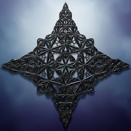 A highly detailed, complex black geometric fractal structure resembling a starburst, with sharp angles and repeating patterns, set against a smooth blue gradient background.