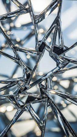 A complex, abstract geometric crystal structure composed of sharp, interconnected metallic facets reflecting light with a blurred bokeh background.