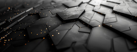 A stark, minimalist backdrop of matte black hexagon bricks with a rough texture The geometric pattern creates an abstract, industrial aesthetic against a dark, concrete wall This contemporary design embodies modern architecture, urban sophistication, and a touch of raw, industrial chic AI Generative