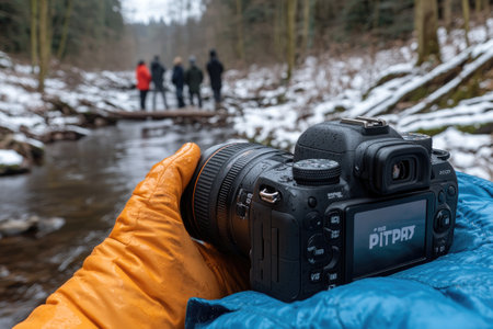 A DSLR Camera Held in a Yellow Glove Beside a Stream in a Snowy Forest