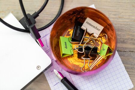 Background with cup of coffee and blurred binocular, pencil, marine sextant lying down on navigational chart.