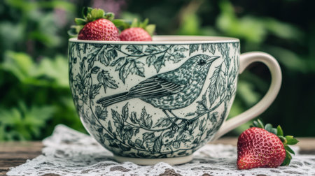 A beautifully designed tea cup featuring a bird illustration sits on a rustic wooden table, accompanied by fresh strawberries and delicate lace, showcasing Natural beauty.
