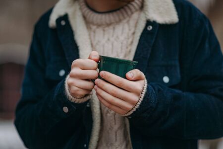A mug of tea in cold weather. A cup of tea in a woman's hands.