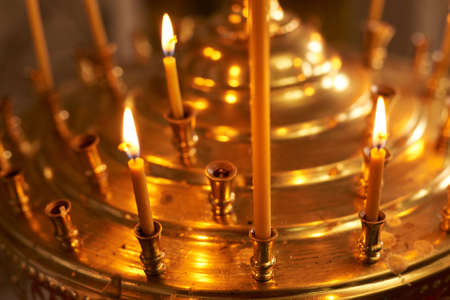 Close up detail view of christian hanging oil candle of brass and glass, hanging in church in front of religious iconography and iconostasis
