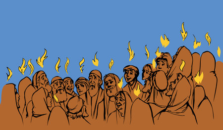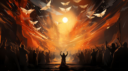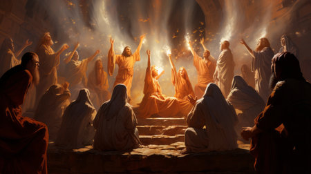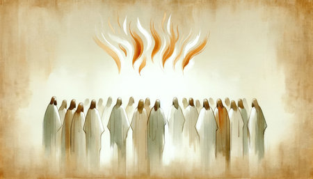 Pentecost Sunday: The Holy Spirit Comes as Tongues of Fire. Digital illustration of the Holy Spirit descending on the believers. Rear view.