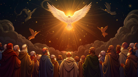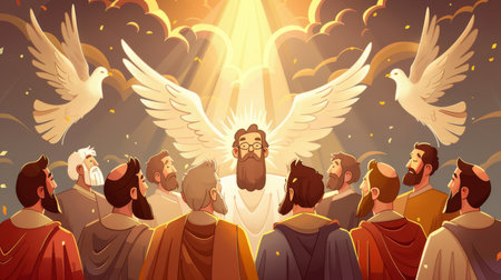 29051251 08 Cartoon Vector Artistic rendering of the Pentecost, with the Apostles gathered in prayer and the Holy Spirit descending upon them in a divine manifestation --ar 16:9 --style raw --stylize 250 Job ID: 609458ac-d6b1-4480-b76c-628982e51536