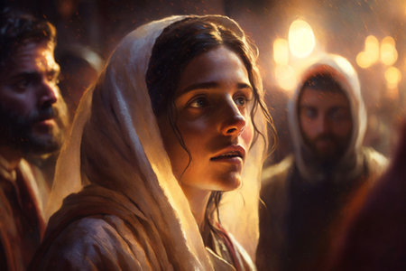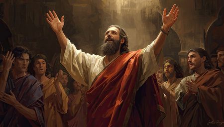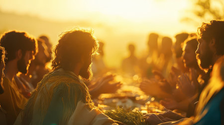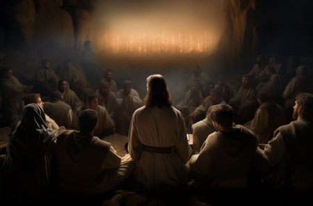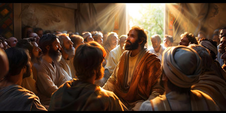 Digital artwork depicting a Christian biblical scene with Jesus Christ and disciples. Concept Religious Art, Biblical Illustration, Digital Painting, Christian Faith, Jesus and Disciples