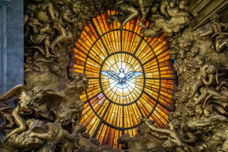 VATICAN - SEPTEMBER, 25, 2018: View at stained glass window with Holy Spirit dove Symbo in St. Peter's Basilica in Vatican. Saint Peter's Basilica has the largest interior of any Christian church in the world.