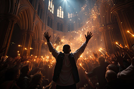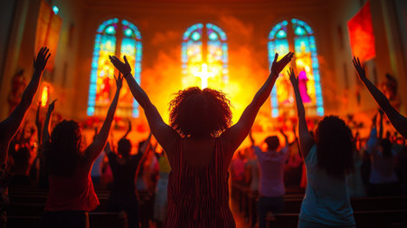 spacious church hall congregation men and women passionately sings hymns holding hands and raising their arms illuminated soft glowing light symbolizing Holy Spirit.