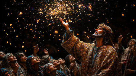 stunning puppet performance features Jesus figure in ornate golden robes, raising his hand in blessing as smaller puppets gather below, illuminated heavenly light