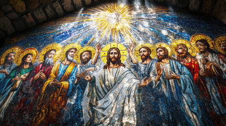 This beautiful mosaic artwork captures Jesus and his disciples in a sacred setting, illuminated by radiant light. A profound representation of faith and spirituality.