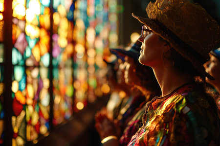 Surveying scene: Gospel choir shines under stained glass, shepherd is speaking., generative IA