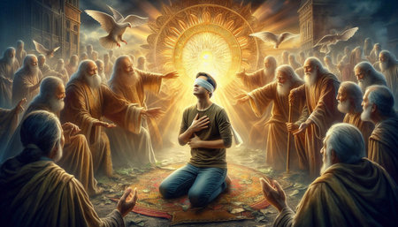 A mystical white flame hovers above a gathering of people in ancient robes, bathed in warm beige and soft orange tones, capturing a moment of divine connection.