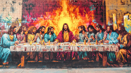 A lively urban depiction of the Last Supper showcases Jesus and his disciples in colorful clothing, set against a backdrop of bright flames and graffiti.