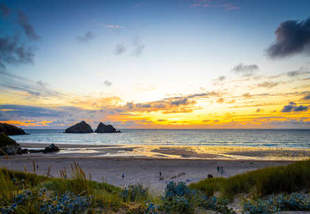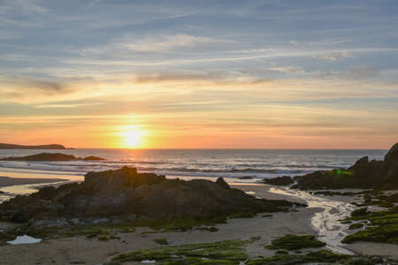 Stunning sunset over the rocky beach at Trevone Bay near Padstow in Cornwall