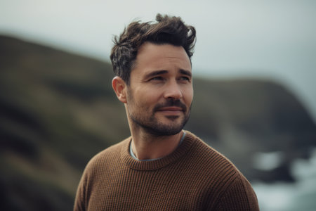Portrait of handsome young man in sweater looking away while standing outdoors