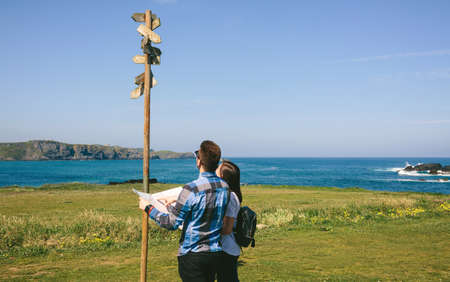 Young couple looking a map and direction sign near the coast