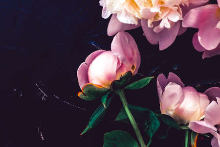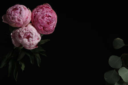 panoramic floral banner. beautiful pink peonies on a black background with place for text. minimalistic composition in a dark key. flat lay, moody floral, copy space.