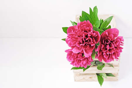 Flower composition. Fresh peonies are in a wooden box. Drops of water are on the flower petals. Copy space.