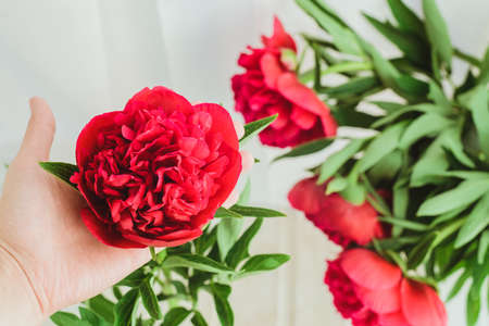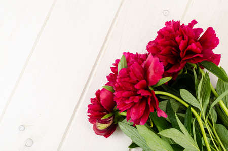 background of peonies. Bouquet of beautiful flowers peonies. Red peonies close-up in beautiful art processing.