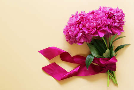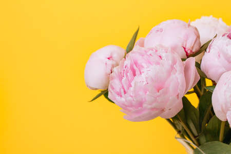 close-up fresh bouquet of pink peonies on yellow background. holiday and gifts concept