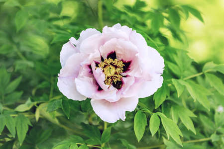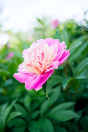 Beautiful peonies flower background with green leaves in garden. Nature scenic wallpaper