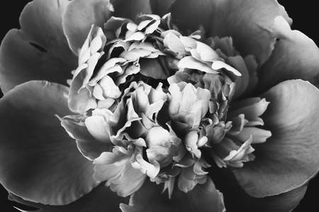 Beautiful lush peony closeup. Black and white photo. Floral card, poster design with copy space