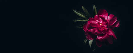Beautiful magenta peony on black. Minimal moody Floral banner, copy space.