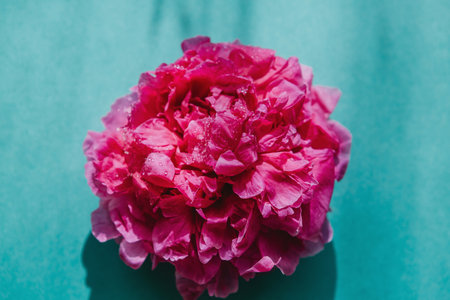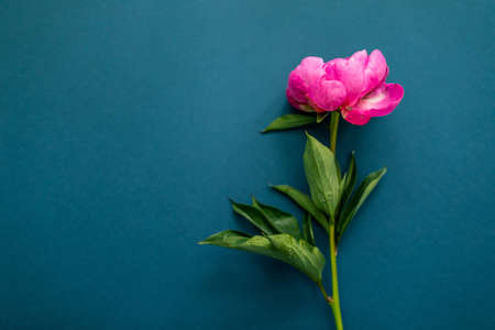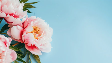 Pink peony flowers on a blue background. Copy space. Floral concept, event invites.