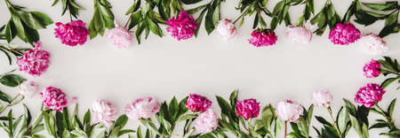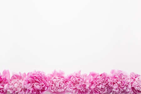 Fresh pink peony flowers border with copy space on white marble background, flat lay.