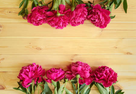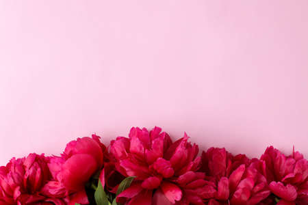 Frame of beautiful bright pink flowers peonies on a gentle pink background. top view. space for text