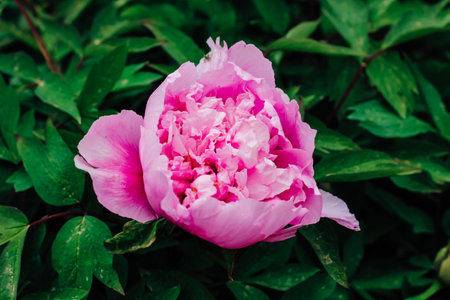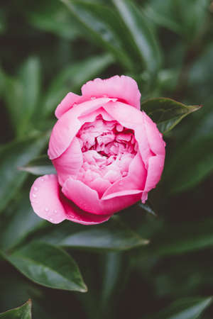 beautiful large pink flowers and dark green foliage. peony garden after the rain. moody floral, close-up.