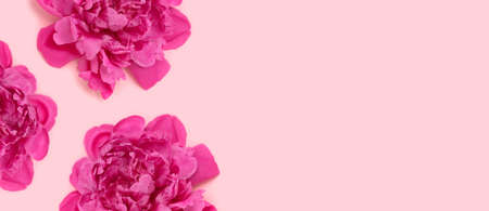 Banner with heads of peony flowers on a pink pastel background. Creative concept.