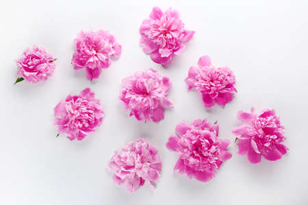 Close-up of pink pion flowers. Valentine's day or Mother's day background. Flat lay composition for entrepreneurs, bloggers, magazines, websites, social media.