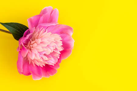 Banner with peony flowers and green leaves on a yellow background. Festive artistic composition with copy space.