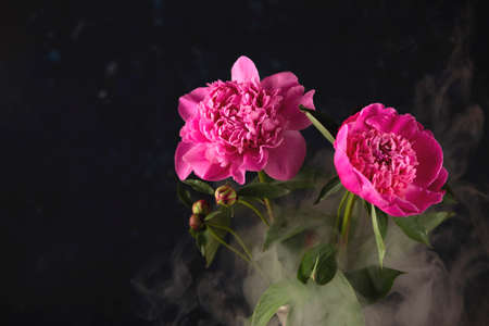 Bright pink peonies in a dark style with smoke around. High quality creative summer photo.
