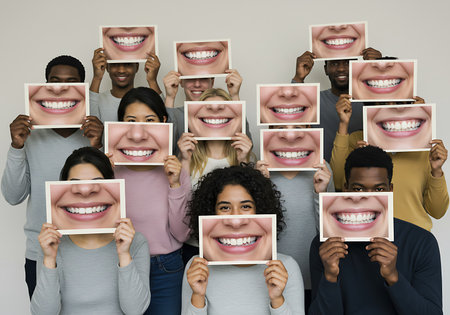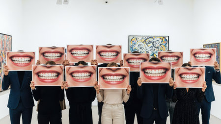A group of individuals stand together, each holding up a printed image of a smiling mouth. The composition showcases a repeating pattern within an indoor setting, likely an art gallery. The lighting appears soft, illuminating the subjects. This image could be used for various commercial and editorial purposes.