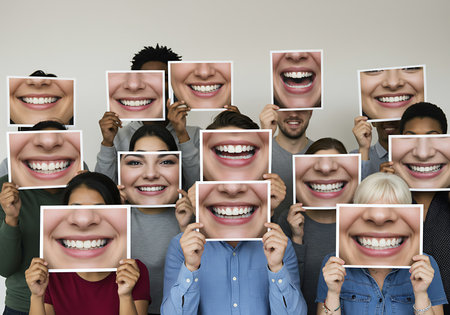 This panoramic image captures the unbridled joy of a mixed group of individuals, showing a spectrum of smiles across ages and ethnicities