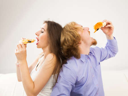 People, italian cuisine concept. Young couple at home eating hot fresh pizza. Delicious fast food meal.