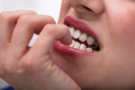 Palette with shades of teeth. Dental samples of tint teeth. Girl chooses perfect teeth color. Close up. High quality photo. Copy space